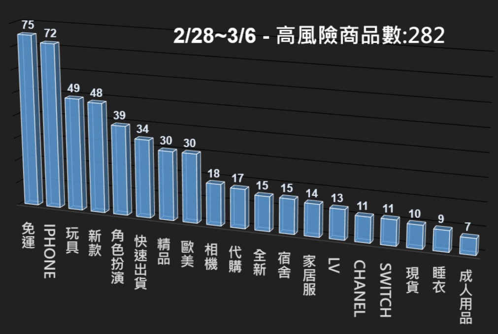 此外,本週觀察到的高風險關鍵字中,亦包含「角色扮演」與「成人用品」等成人向商品類別。此類商品在網路交易環境中往往具有一定隱私需求,部分交易情境可能傾向透過私下聯繫或非公開方式進行,亦可能被不肖業者利用,引導消費者改以平台外方式完成交易。提醒民眾在網路刊登或選購相關商品時,除留意交易安全與平台保障機制外,也應注意商品內容與販售形式是否符合現行法規,例如涉及未成年人保護或兒少法相關法令,以避免衍生法律責任或消費爭議,降低可能發生的交易風險。本署電商防詐雷達本週(2/21~2/27),共掃瞄22,629筆電商平台商品,發現其中239 筆為高風險商品,並已提供相關資訊給電商平台進行預防性下架,以降低消費者接觸詐騙商品的風險。