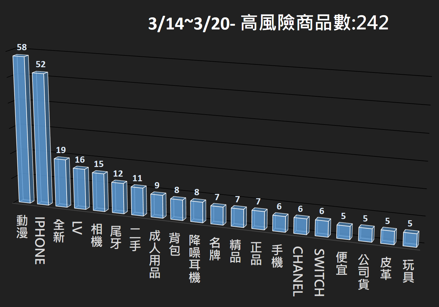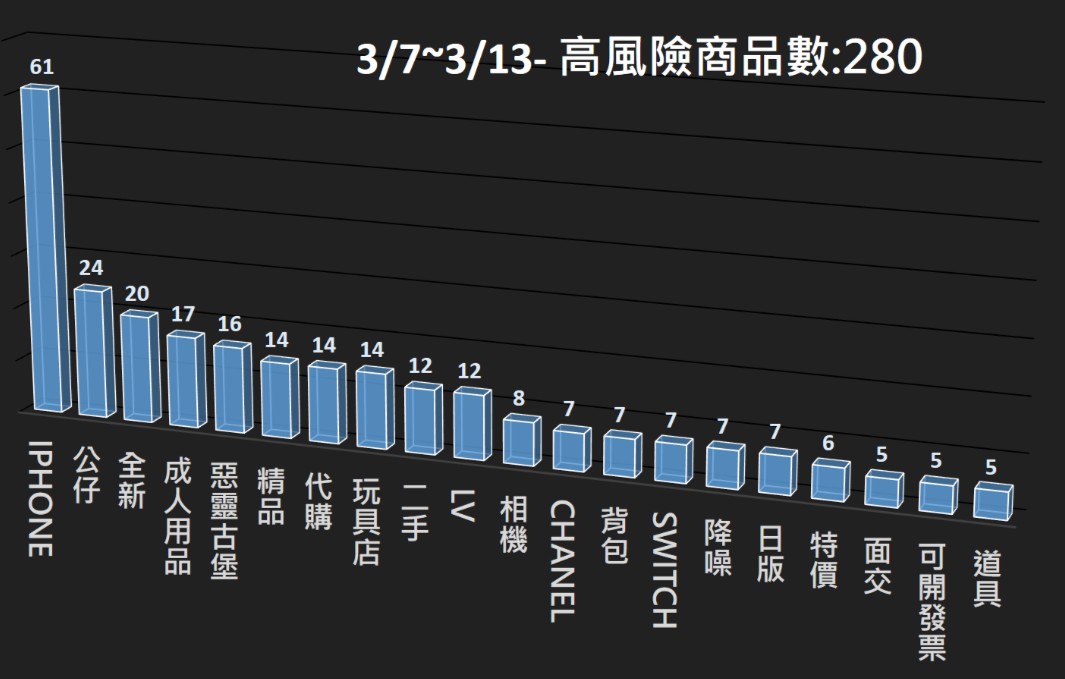 本署電商防詐雷達本週 (3/14~3/20),共掃瞄 10,713 筆電商平台商品,發現其中 242 筆為高風險商品,並已提供相關資訊給電商平台進行預防性下架,以降低消費者接觸詐騙商品的風險。