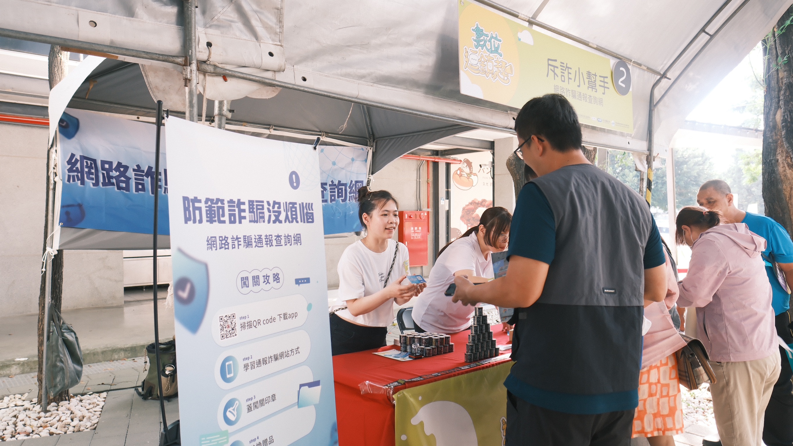 在【斥詐專區】,民眾透過「跑路吧!車手」小遊戲模擬詐騙集團運作流程,透過角色扮演與答題方式,逐步了解詐騙手法,並由現場工作人員即時解說,協助提升辨識詐騙能力。同時邀請民眾加入LINE「防詐動態警報」官方帳號,將即時防詐提醒整合進日常通訊工具,提升預警能力。並介紹「網詐通報查詢網」APP,現場教學如何回報可疑網址,透過全民參與建立主動通報機制,讓防詐成為日常生活習慣。