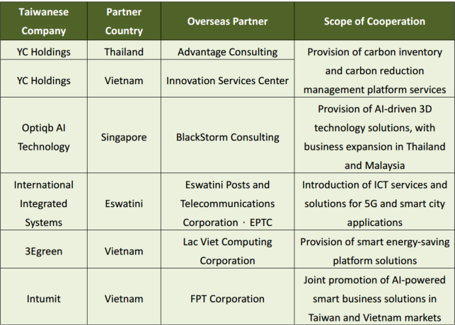 Taiwanese companies, including YC Holdings, Optiqb AI Technology, International Integrated Systems, 3Egreen, and Intumit, signed agreements with partners from Thailand, Vietnam, Singapore, and Eswatini. The cooperation covers areas such as carbon management platforms, AI 3D solutions, 5G smart city applications,and energy-saving systems. These outcomes highlight Taiwan’s capability in expanding digital solutions to global markets.