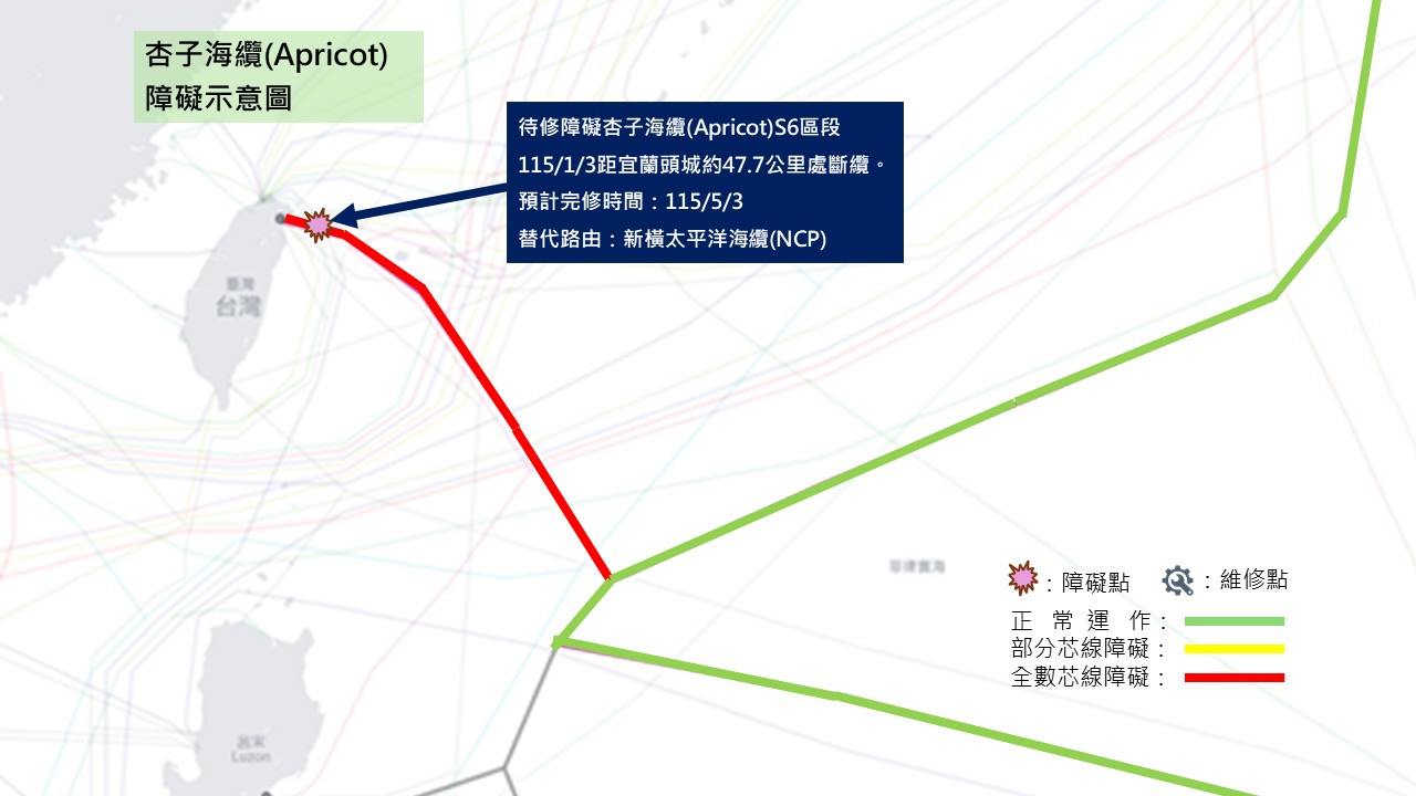 九、杏子海纜障礙示意圖 中華電信官方公告:杏子海纜 Apricot S6區段障礙說明