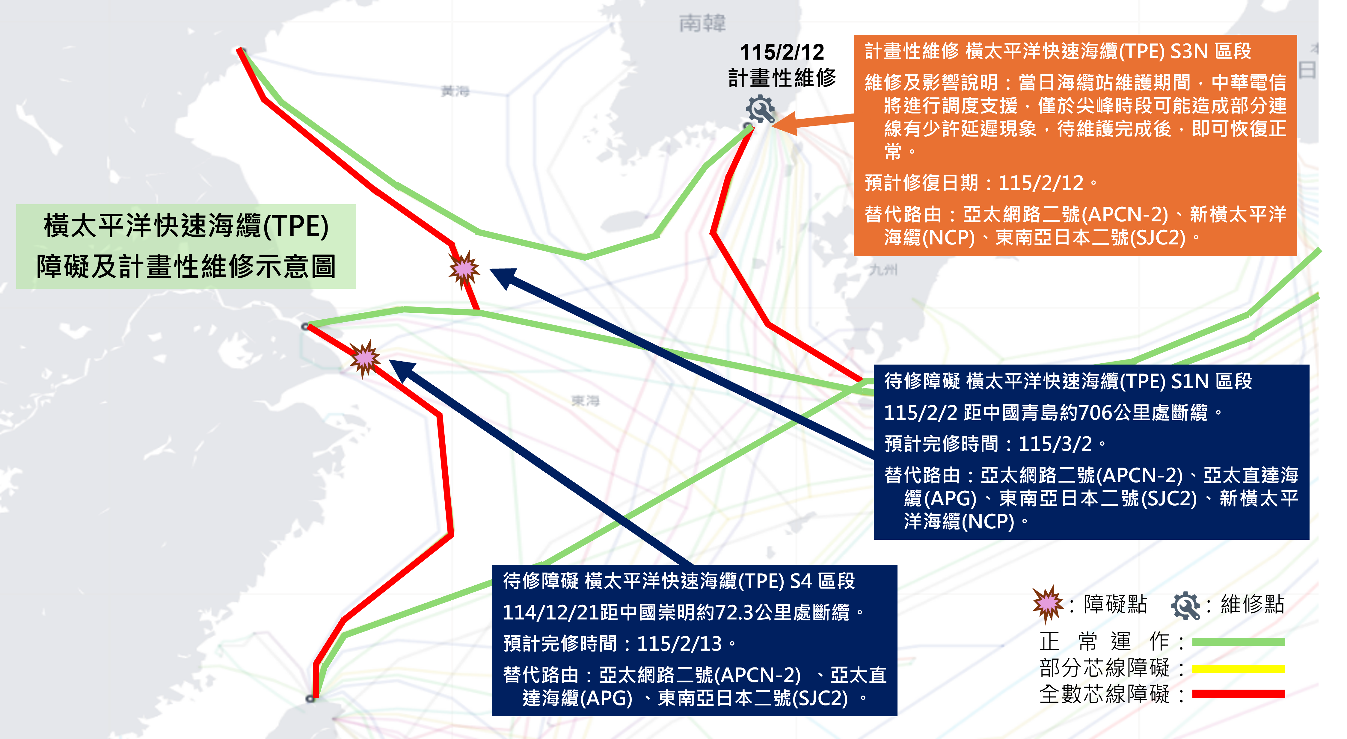 五、橫太平洋快速海纜障礙示意圖 中華電信官方公告:橫太平洋快速海纜網路(TPE)S4區段障礙說明 | 中華電信 CHT.com.tw橫太平洋快速海纜網路(TPE)S1N區段障礙說明|中華電信CHT.com.tw
