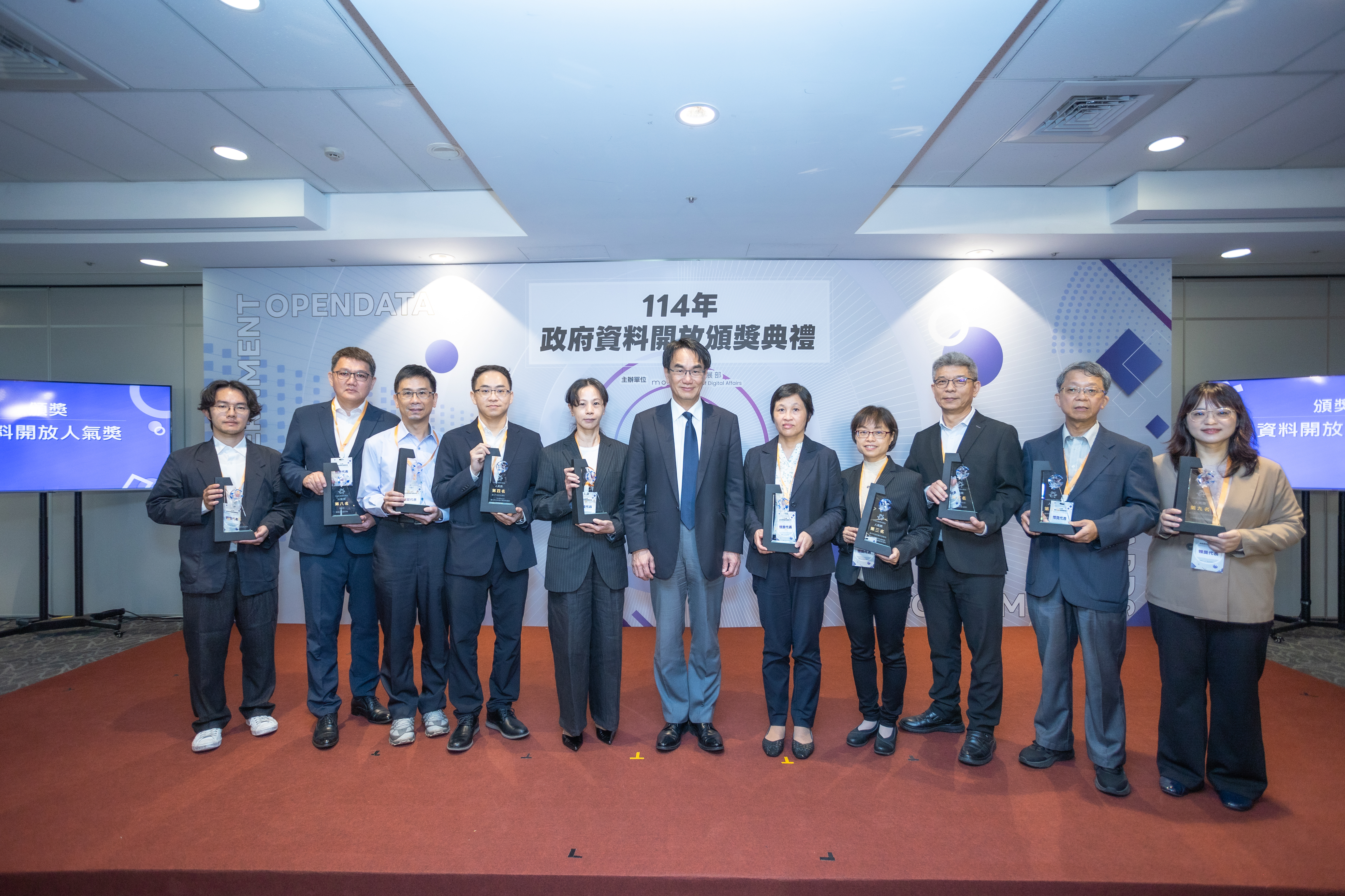 數位發展部今(1)日上午於臺北文創大樓舉辦「114年政府資料開放頒獎典禮」,表揚中央與地方政府在資料開放、資料治理及創新應用上的卓越成果。行政院吳誠文政務委員與數位發展部林宜敬部長共同出席授獎,肯定各機關(構)長年推動資料開放的努力。本次活動首度新增「開放文本語料績優獎」,宣示臺灣政府資料開放正式邁入支援AI人工智慧發展的新階段。